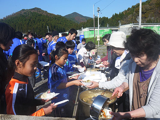 女川町議会議員も参加しました。近所のお母さん方は、豚汁や混ぜご飯、お握りなど得意料理を持ち寄ってくれました。サッカー教室には、東京のボランティアがボールを寄付してくれました。参加した子どもたちは約20名。地元のサッカーチーム「コバルトーレ女川」が指導しました。